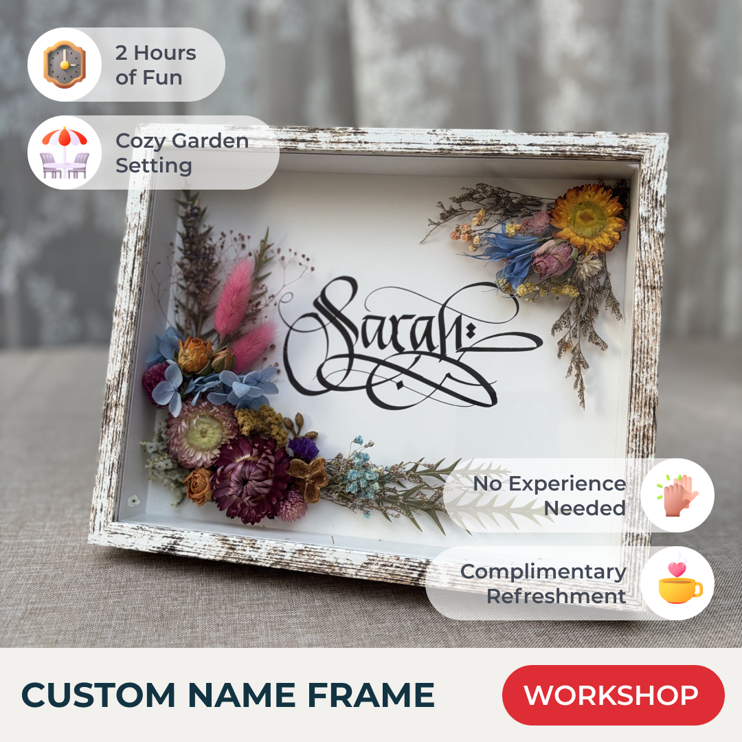 The Name Frame flower workshop exceeded my expectations! The instructors were friendly, the environment peaceful, and I felt proud of the beautiful piece I created.